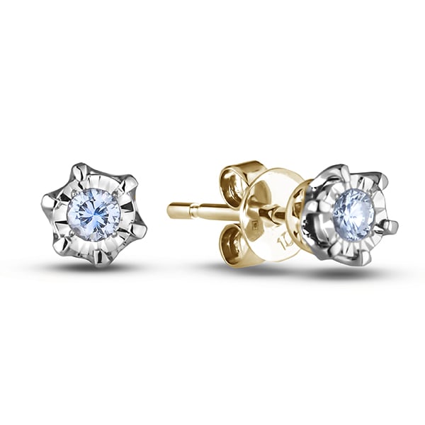 10K white and yellow gold miracle setting 6-claw diamond stud earrings featuring 0.11 carat total weight round brilliant cut diamonds.
