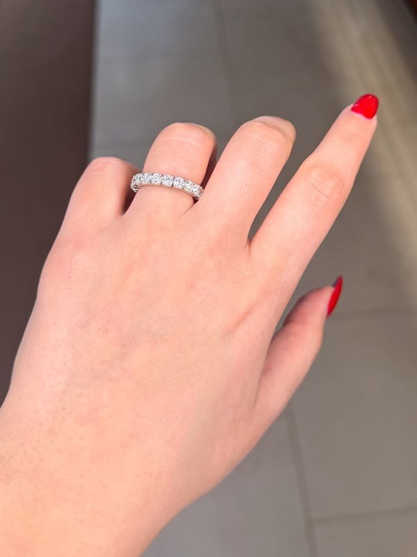 14K white gold diamond eternity ring featuring 3.68 carat total weight round brilliant cut diamonds.