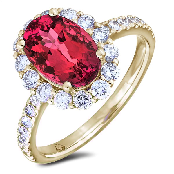 10K yellow gold halo ring featuring a 3.10 carat oval rhodolite garnet, accented by 0.80 carat total weight round brilliant cut Canadian diamonds.