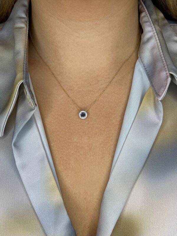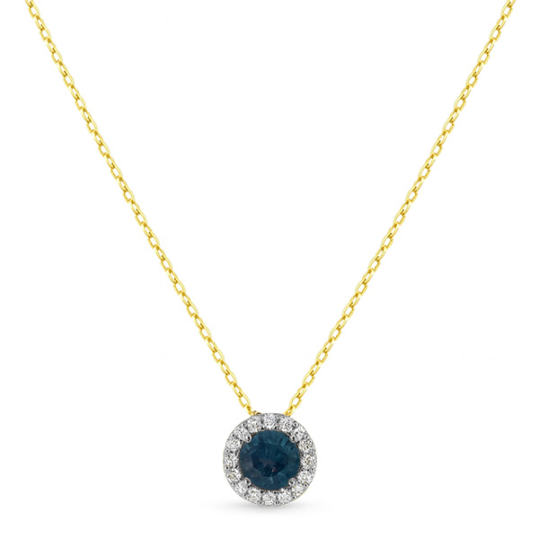 14K yellow and white gold halo alexandrite and Canadian diamond pendant featuring a 0.41 carat round cut alexandrite, accented by 0.16 carat total weight round brilliant cut diamonds.