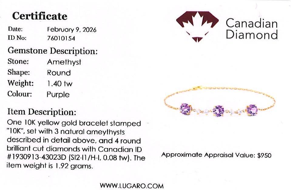 10K yellow gold dainty chain bracelet featuring 1.40 carat total weight amethyst, accented by 0.08 carat total weight melee Canadian diamonds.