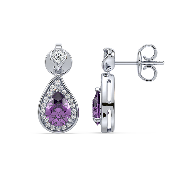 10K white gold drop earrings featuring 2.19 carat total weight pear cut amethysts, accented by 0.40 carat total weight round brilliant cut diamonds.