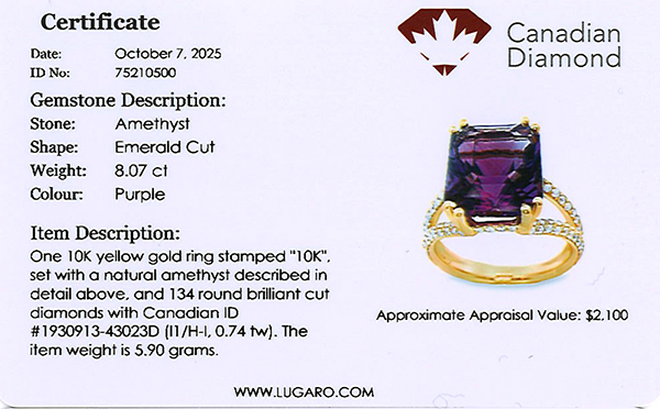 10K yellow gold ring featuring a 8.07 carat amethyst, accented 0.74 carat total weight round brilliant cut melee Canadian diamonds.