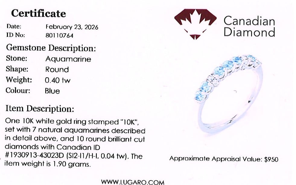 10K white gold anniversary ring featuring 0.40 carat total weight round aquamarine, accented by 0.04 carat total weight round brilliant cut melee Canadian diamonds.