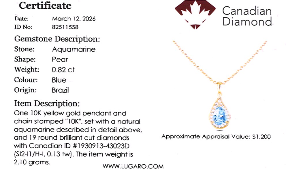 10K yellow gold halo pendant featuring a 0.82 carat aquamarine, accented by 0.13 carat total weight round brilliant cut melee Canadian diamond.
