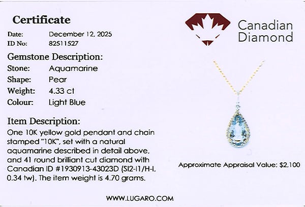 10K white and yellow gold pendant featuring a 4.33 carat aquamarine, accented by 0.34 carat total weight round brilliant cut Canadian diamonds.