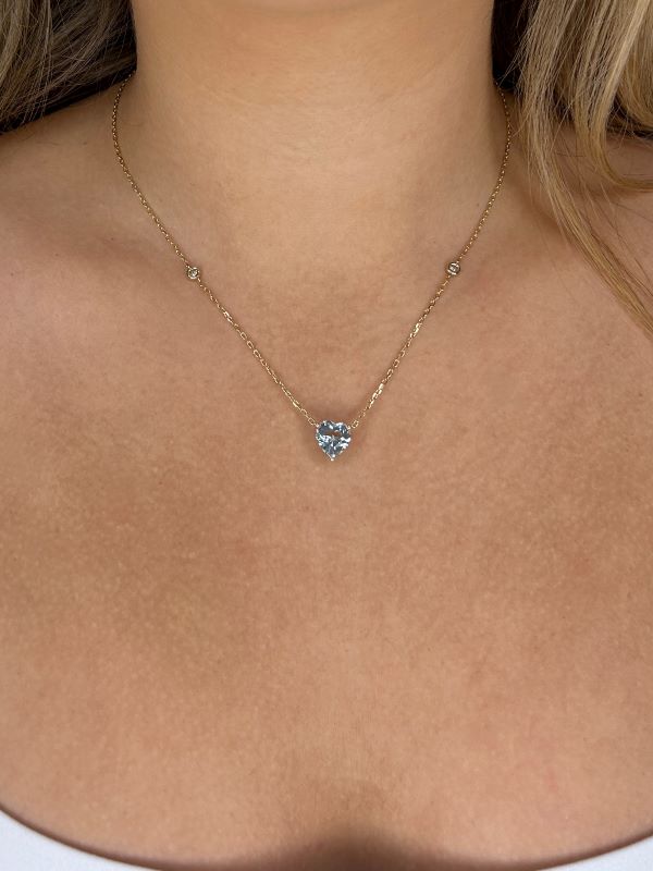 10K yellow gold necklace featuring a 0.17 carat total weight round brilliant cut Canadian diamond ,accented by 2.56 carat total weight aquamarine.