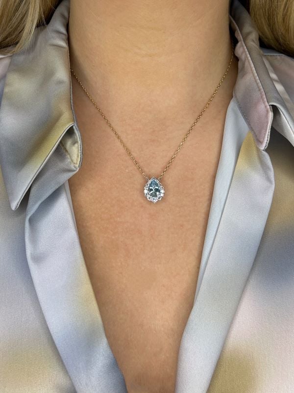 14K yellow and white gold halo necklace featuring a 1.76 carat aquamarine, accented by 0.10 carat round brilliant cut De Beers Forevermark diamonds and 0.50 carat total weight round brilliant cut diamonds.