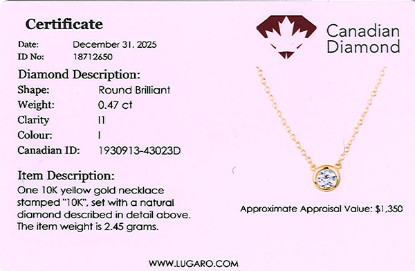 Solitaire diamond necklace includes Canadian diamond certificate.