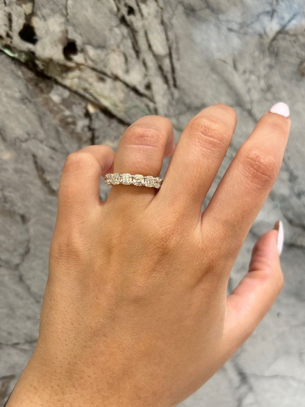 18k yellow gold Black Label De Beers Forevermark diamond eternity ring featuring 7.90 carat total weight ideal cushion cut De Beers Forevermark diamonds.