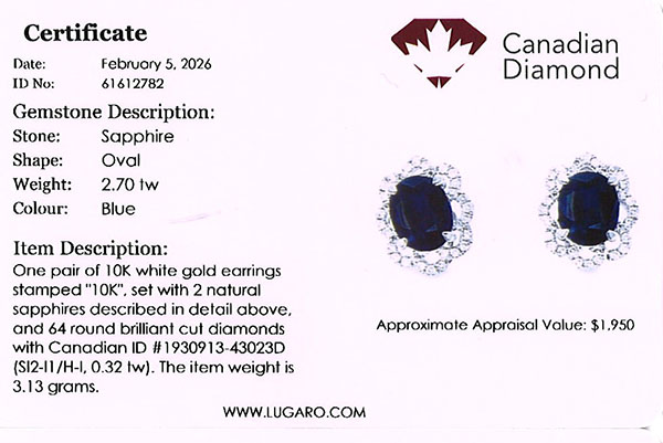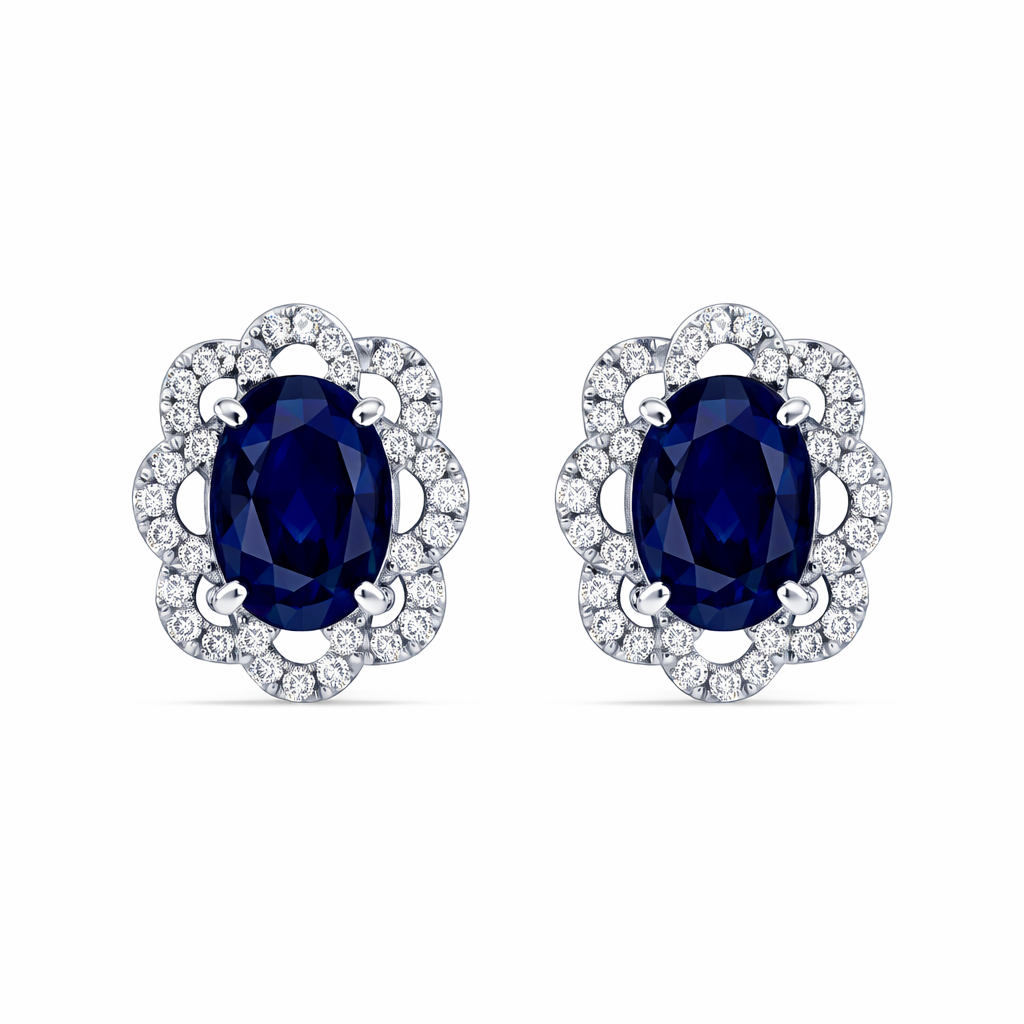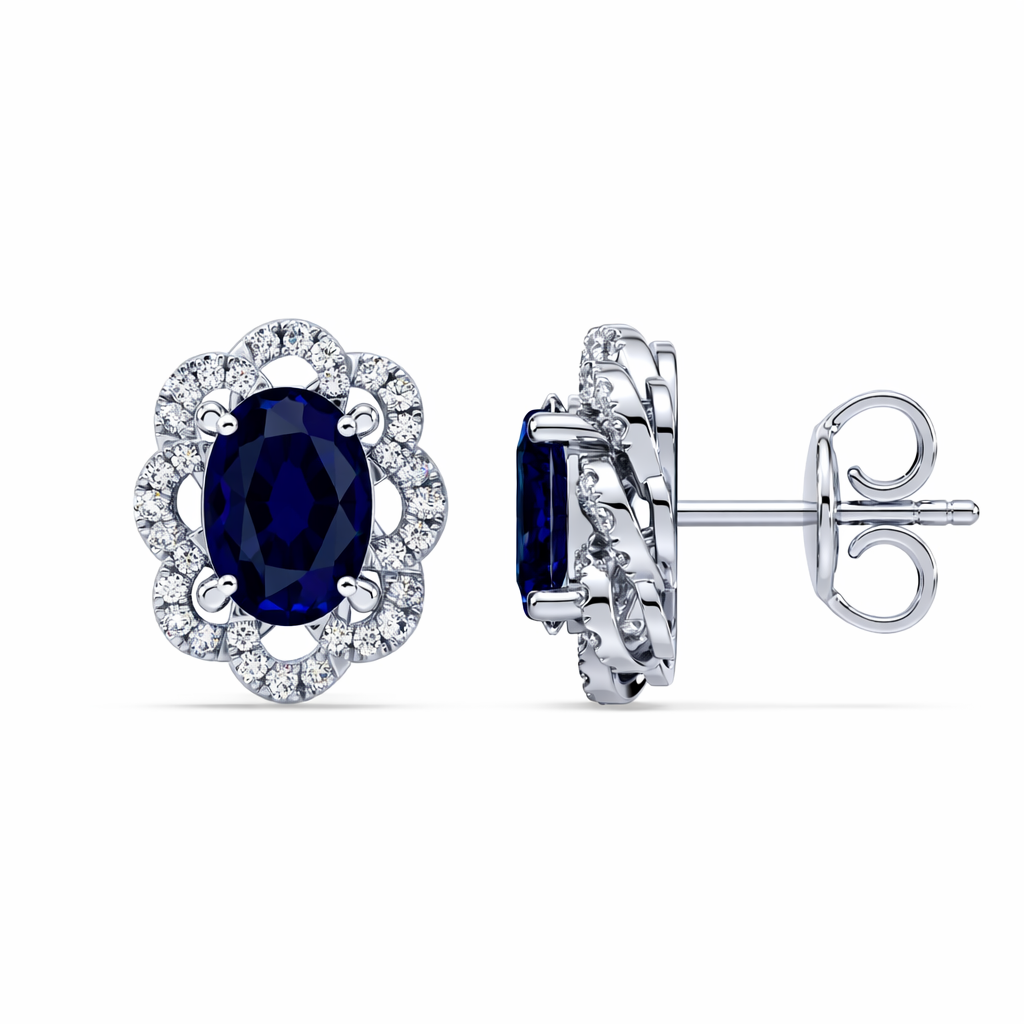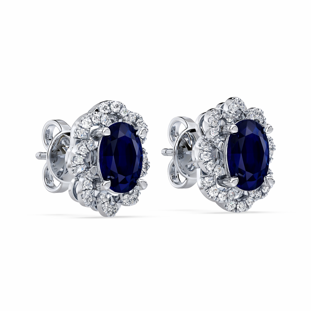10K white gold stud earrings featuring 2.70 carat total weight sapphire, accented by 0.32 carat total weight round brilliant cut melee Canadian diamond.