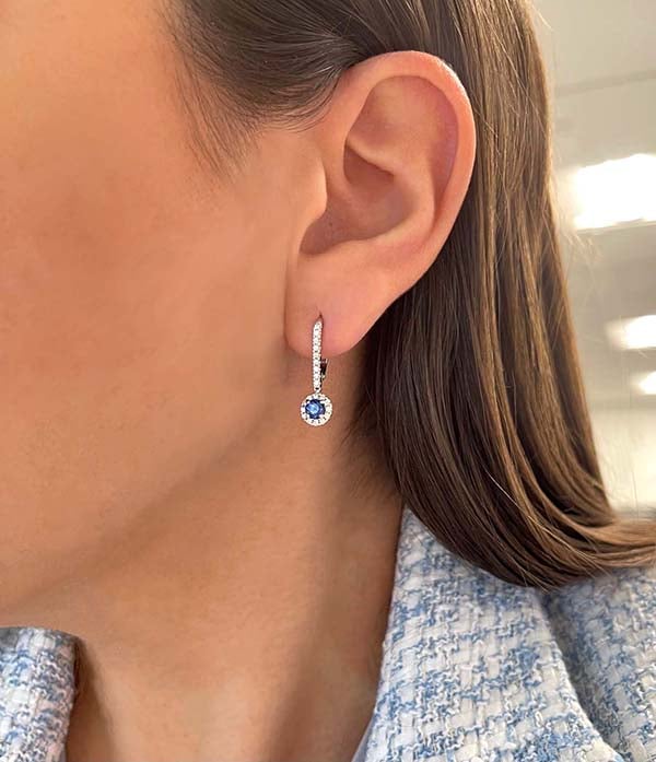 Be the first to review “Blue Sapphire and Canadian Diamond Dangle Hoop Earrings in White Gold”