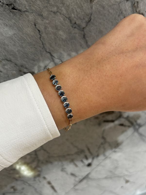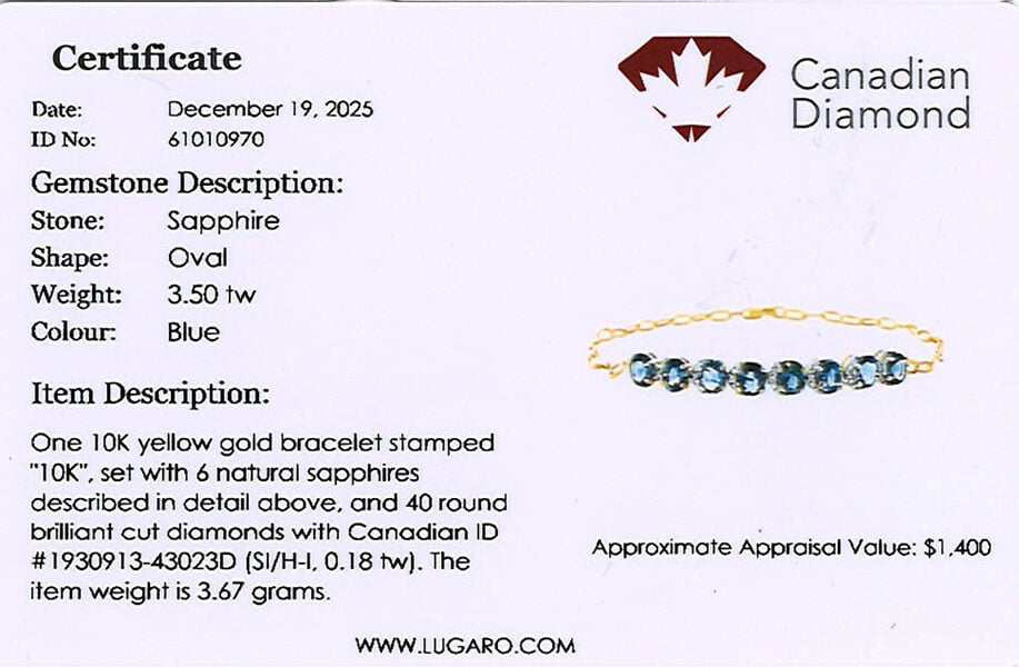 10K yellow gold bracelet featuring 3.50 carat total weight sapphire, accented by 0.18 carat total weight round brilliant cut melee Canadian diamonds.