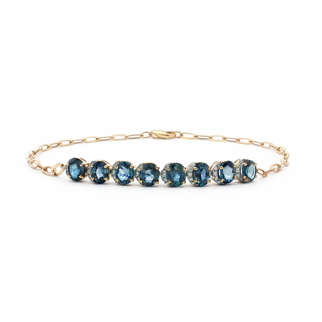 Blue Sapphire and Canadian Diamond Half Halo Paperclip Chain Bracelet in Yellow Gold