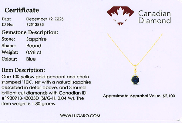 14K yellow gold diamond pendant featuring a 0.98 carat round sapphire, accented by 0.04 carat total weight Canadian diamonds.