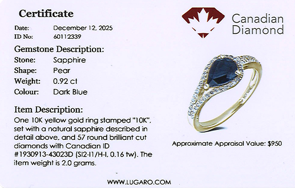 Ring includes a Canadian diamond certificate.
