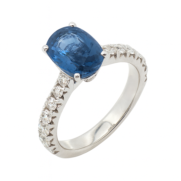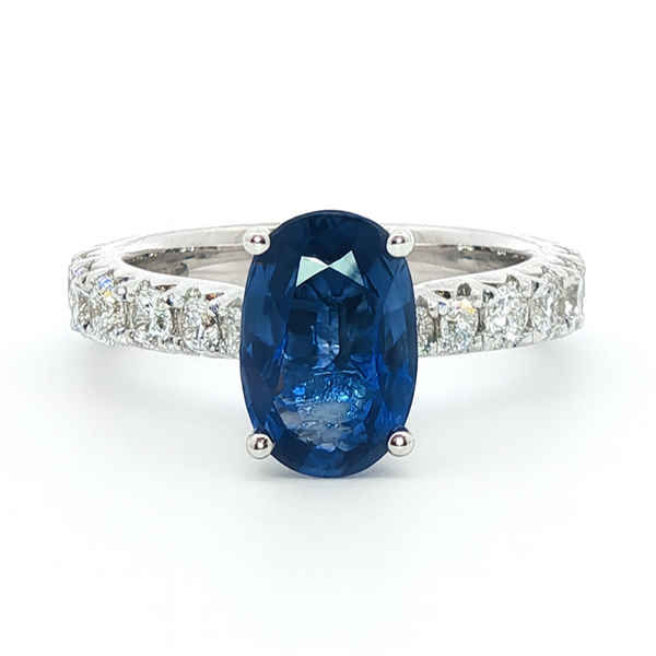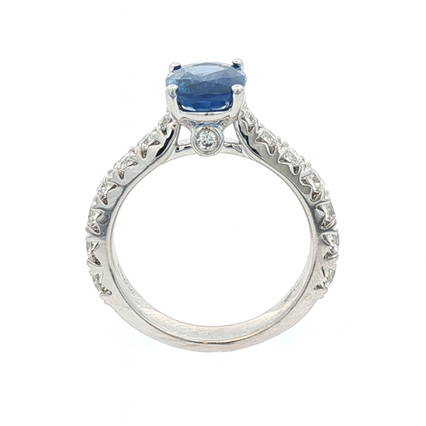 18K white gold ring featuring a 2.17 carat blue sapphire, accented by 1.03 carat total weight round brilliant cut diamonds.