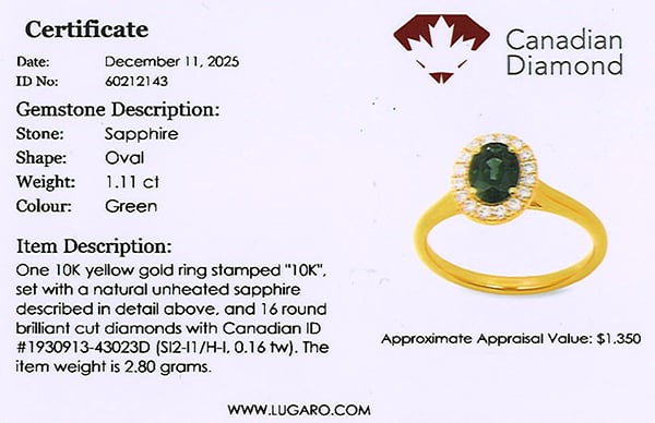 Ring includes Canadian diamond certificate.