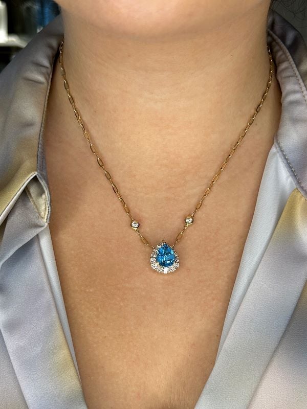Be the first to review “Blue Topaz and Canadian Diamond Halo Pendant with Bezel Set Paperclip Chain in Yellow Gold”