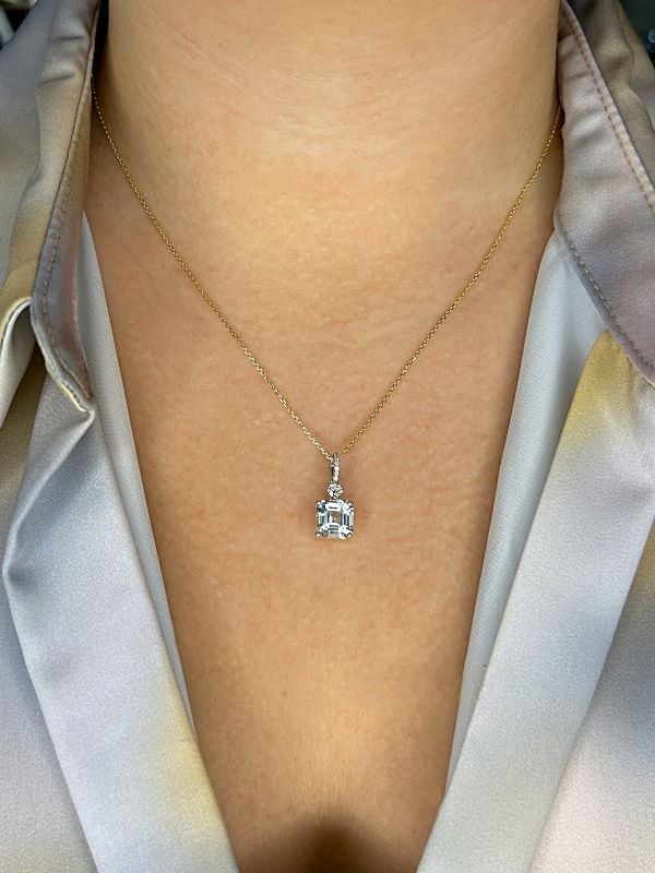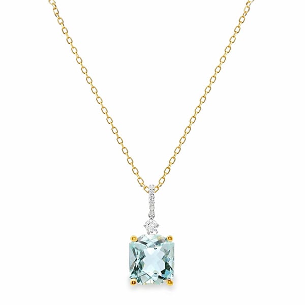 14K yellow and white gold pendant featuring a 2.46 carat Brazilian aquamarine, accented by 0.10 carat total weight round brilliant cut De Beers Forevermark diamonds and 0.03 carat total weight round brilliant cut melee diamonds.
