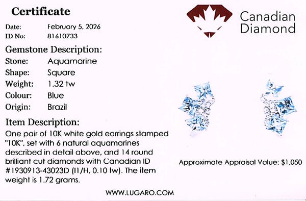 10K white gold earrings featuring 1.32 carat total weight aquamarine, accented by 0.10 carat total weight round brilliant cut melee Canadian diamonds.