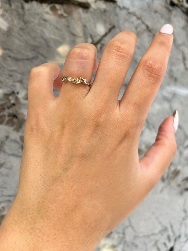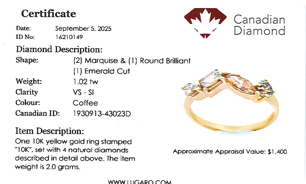 10K yellow gold diamond ring featuring 1.02 carat total weight Canadian coffee diamonds in marquise, emerald, and round brilliant cuts.