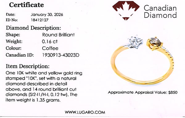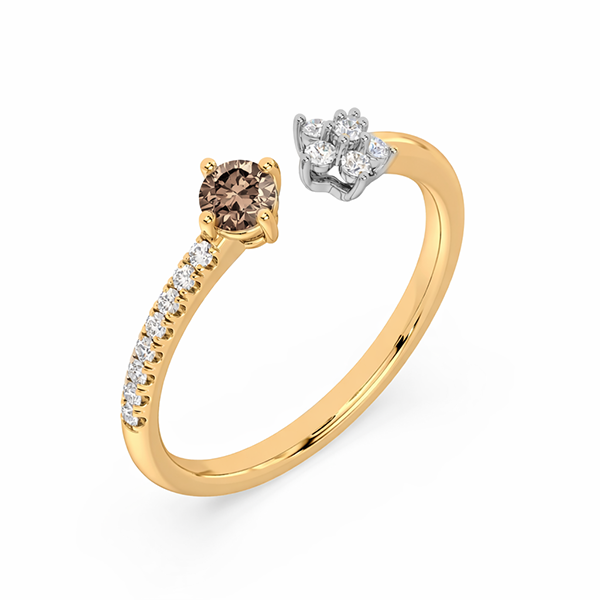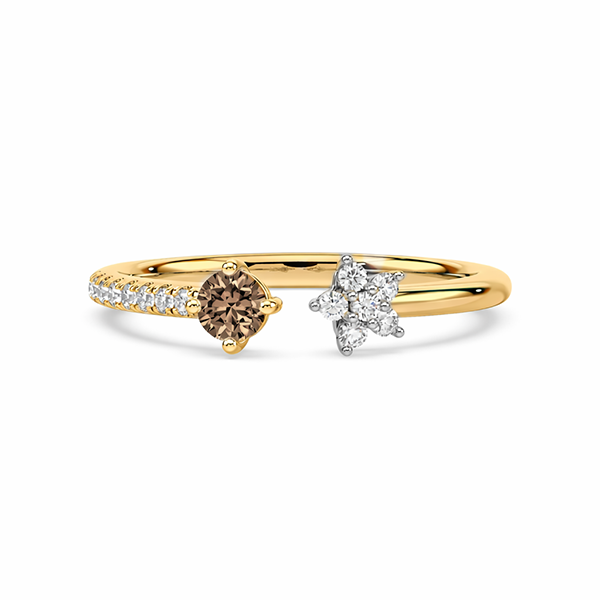 10K yellow and white gold ring features 0.16 carat round brilliant cut coffee Canadian diamond, accented by 0.12 carat total weight round brilliant melee diamonds.