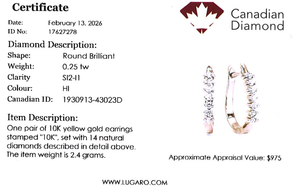 10K yellow gold diamond hoop earrings featuring 0.25 carat total weight round brilliant cut Canadian diamonds.