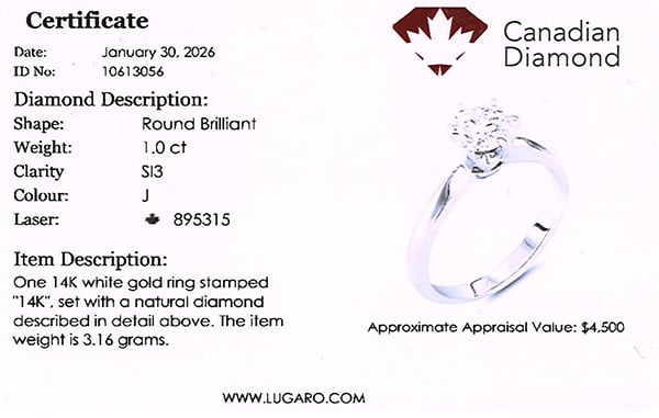 Engagement ring includes a Canadian diamond certificate.