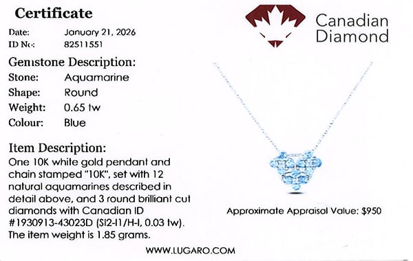10K white gold diamond pendant featuring 0.03 carat total weight round brilliant cut Canadian diamonds, accented by 0.65 carat total weight aquamarine.