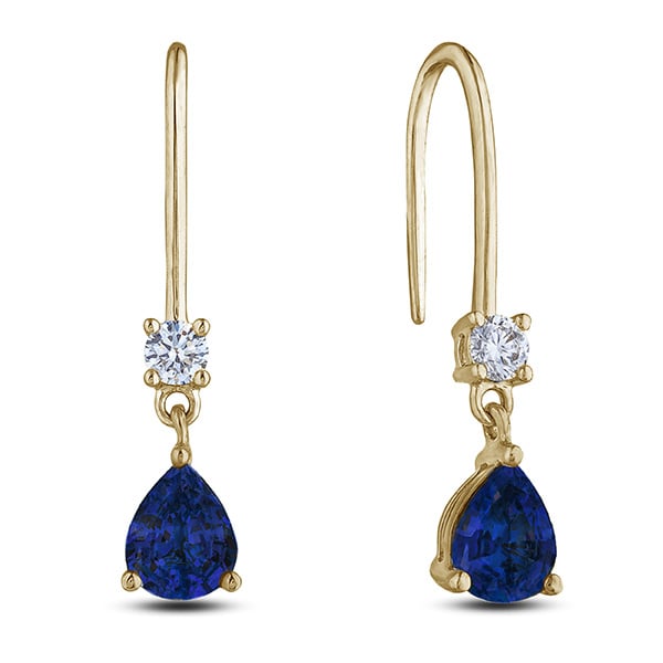 10K yellow gold drop earrings featuring 1.80 carat total weight pear shape sapphires, accented by 0.20 carat total weight round brilliant cut Canadian diamonds.