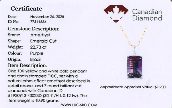 10K white and yellow gold pendant featuring a 22.73 carat amethyst, accented by 0.12 carat total weight round brilliant cut Canadian diamonds.