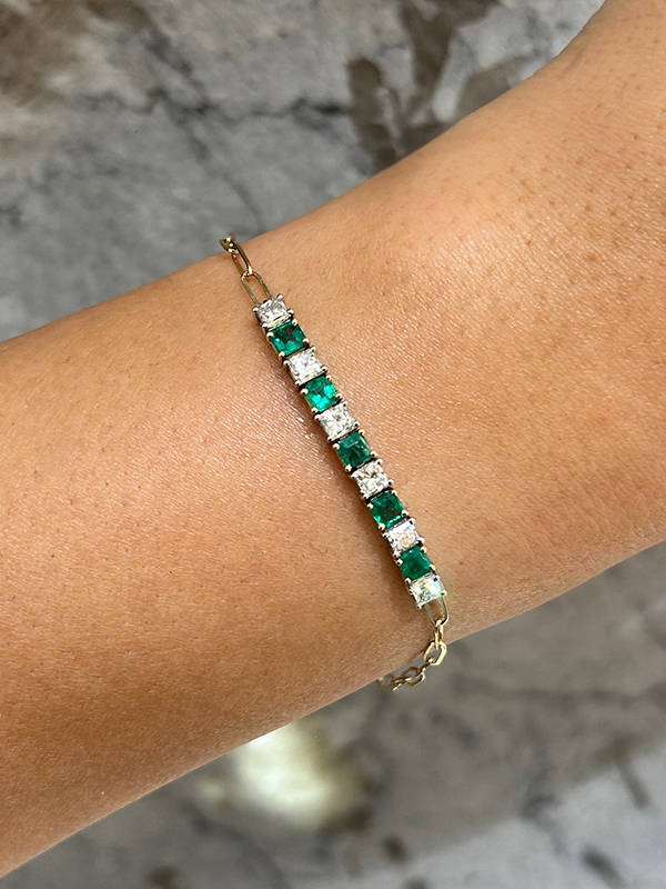 14K white and yellow gold bracelet featuring 0.93 carat total weight square cut emerald accented by 1.30 carat total weight Canadian diamonds.