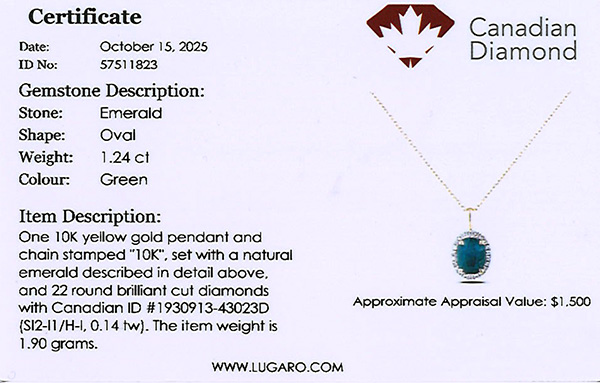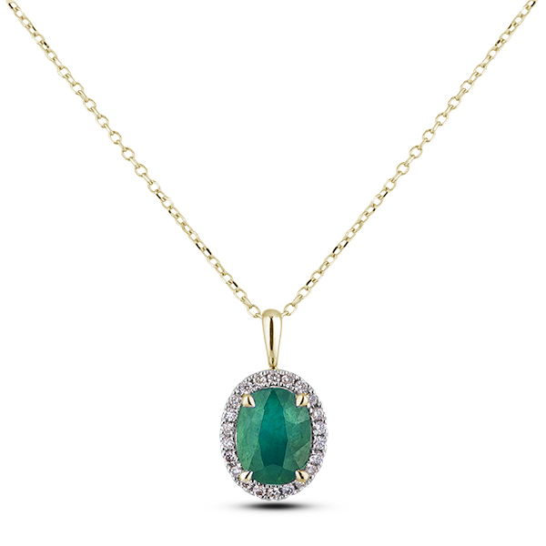 10K yellow gold oval pendant featuring a 1.24 carat oval cut emerald, accented by 0.14 carat total weight round brilliant cut melee Canadian diamonds.