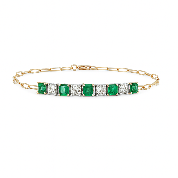 14K white and yellow gold bracelet featuring 1.48 carat total weight square cut emerald accented by 1.06 carat total weight Canadian diamonds.