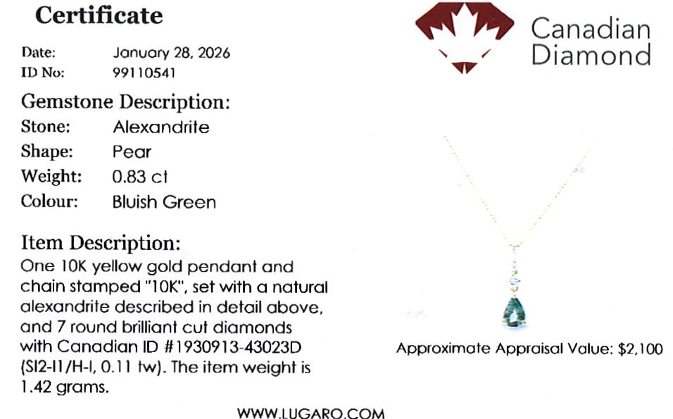 10K yellow gold pendant featuring a 0.83 carat alexandrite, accented by 0.11 carat total weight round brilliant cut Canadian diamonds.