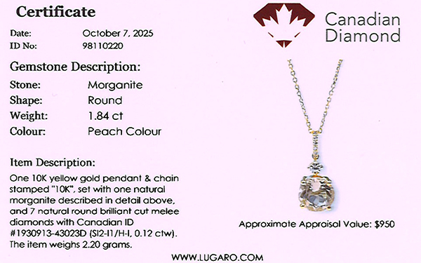 Morganite and diamond pendant includes Canadian diamond certificate.