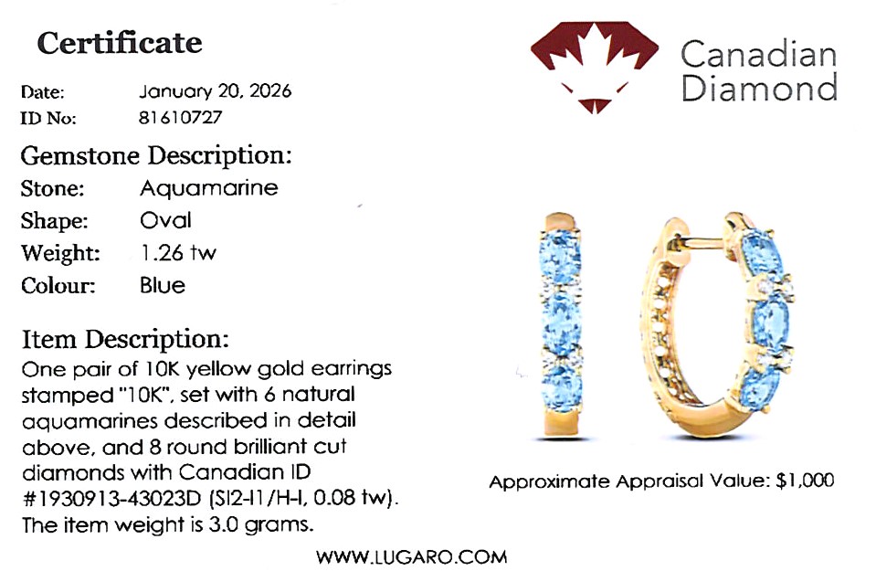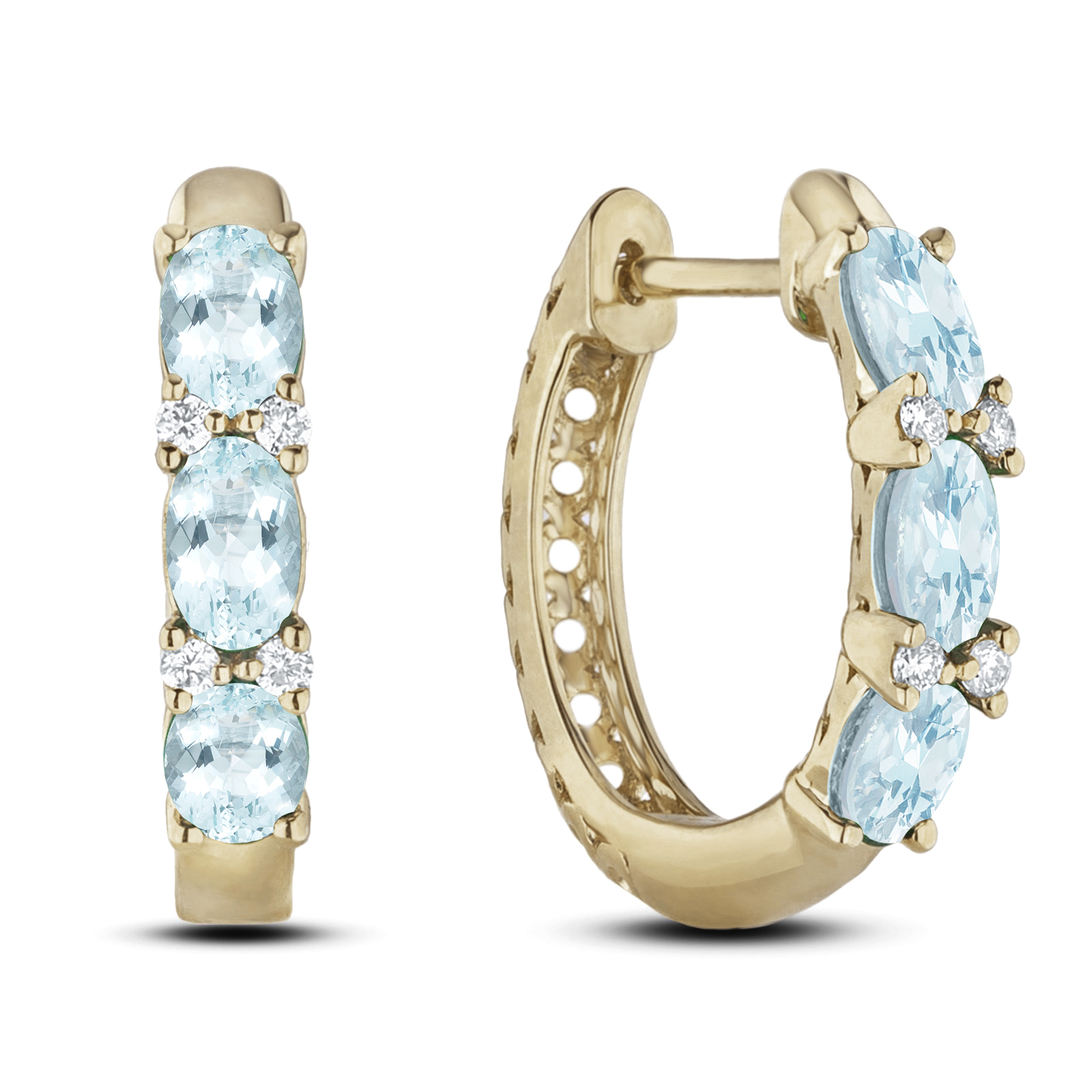 10k yellow gold hoop earrings featuring 1.26 carat total weight oval shaped natural aquamarine, accented by 0.08 carat total weight round brilliant cut Canadian diamonds.