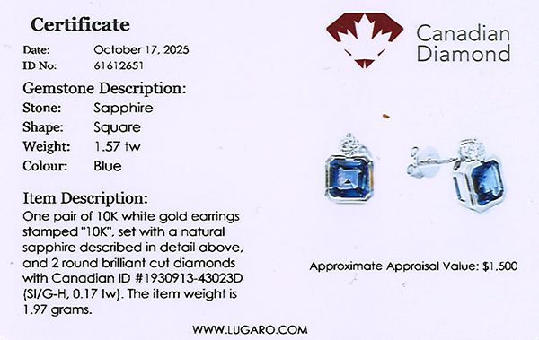 10K white gold earrings featuring 1.57 carat total weight sapphire, accented by 0.17 carat total weight round brilliant cut Canadian diamond.