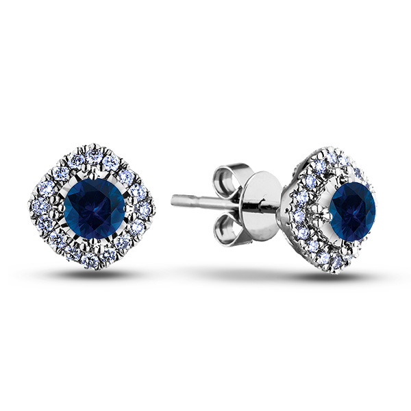 18K white gold halo stud earrings featuring 0.31 carat total weight sapphire, accented by 0.18 carat total weight round brilliant cut Canadian diamonds.