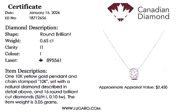 Necklace includes Canadian diamond certificate.