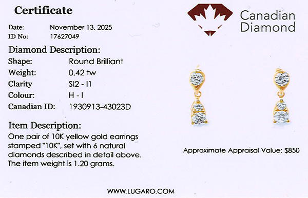 10K yellow gold drop earrings featuring 0.42 carat total weight round brilliant cut Canadian diamonds.
