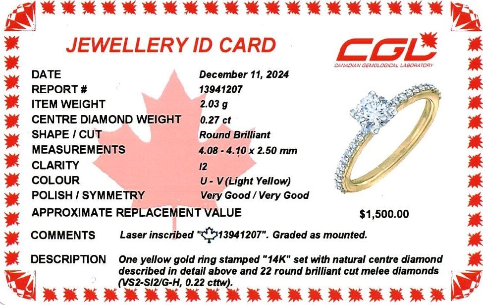 14K yellow gold classic diamond engagement ring featuring a 0.27 carat round brilliant cut Canadian diamond, accented by 0.22 carat total weight round brilliant cut diamonds along the shank.