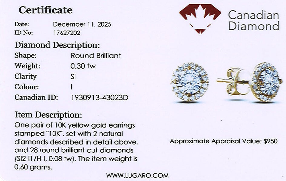 10K yellow gold halo earrings featuring 0.38 carat total weight round brilliant Canadian diamonds.