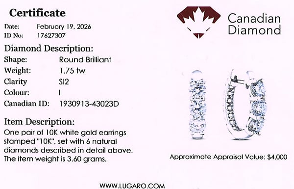 Hoop earrings include Canadian diamond certificate.