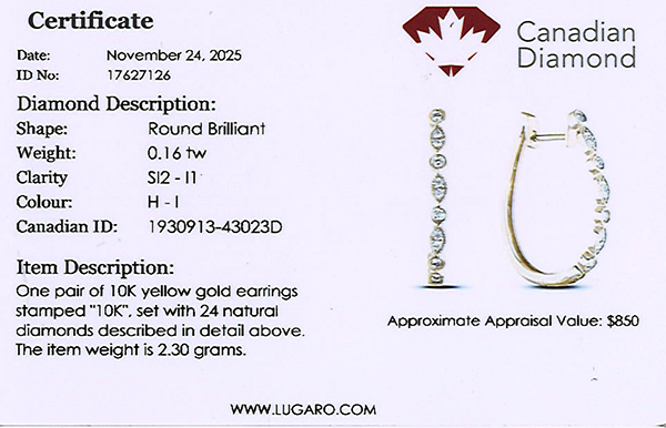 Earrings includes Canadian diamond certificate.