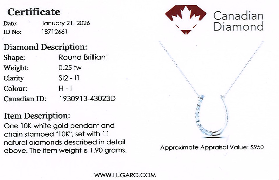10K white gold Canadian diamond horseshoe necklace featuring 0.25  carat round brilliant cut Canadian diamond.