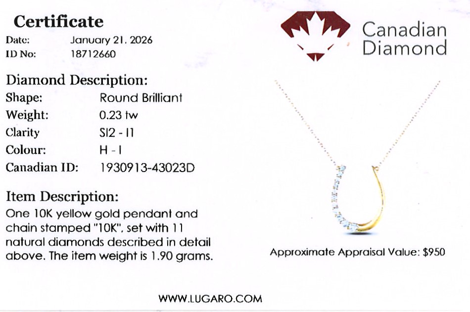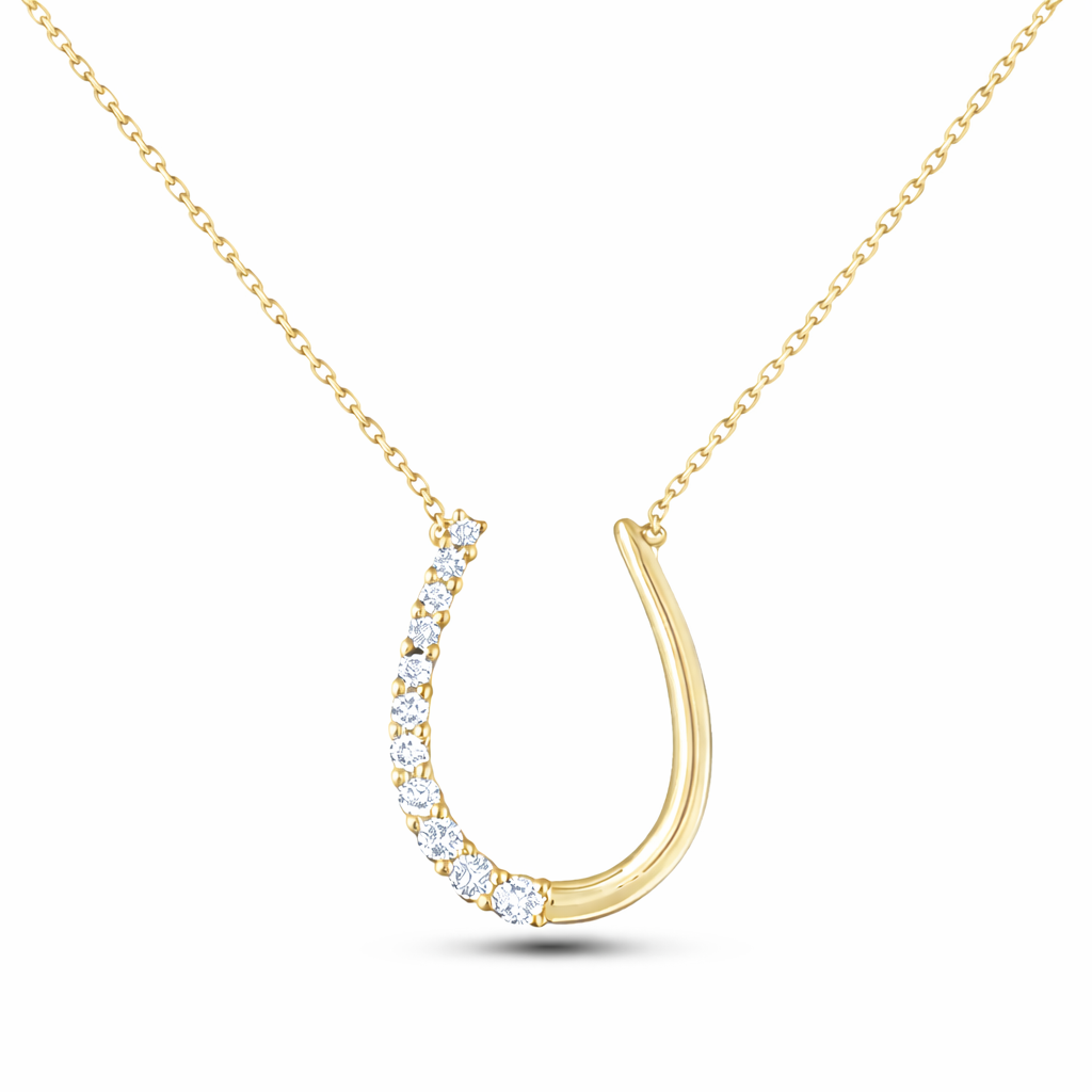 10K yellow gold Canadian diamond horseshoe necklace featuring 0.23  carat round brilliant cut Canadian diamond.