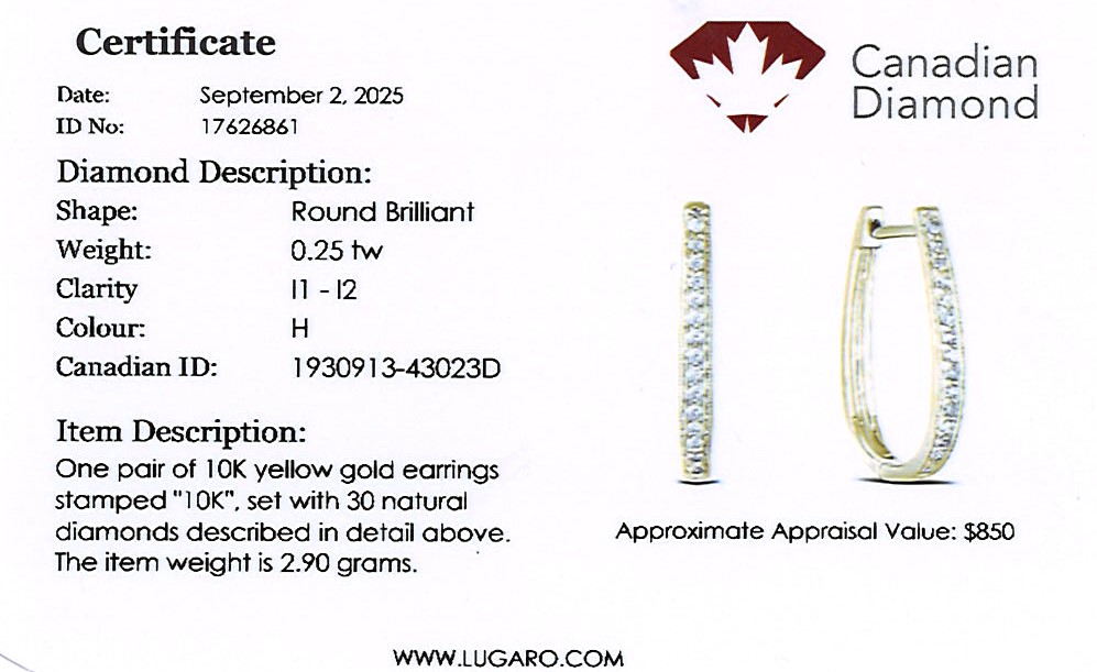 Canadian diamond earrings include Canadian Diamond Certificate.