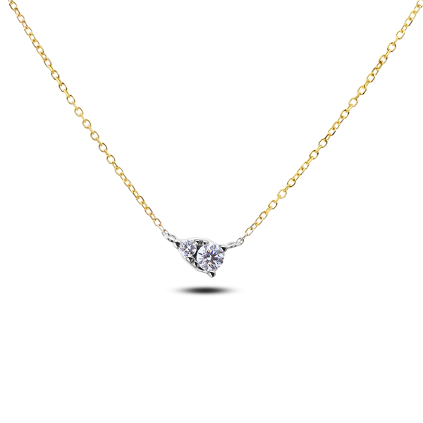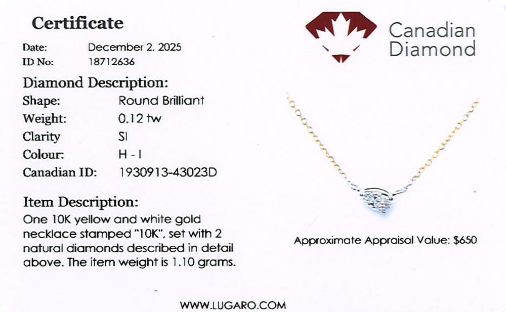 10K yellow gold necklace featuring a 0.12 carat total weight round brilliant cut Canadian diamond.